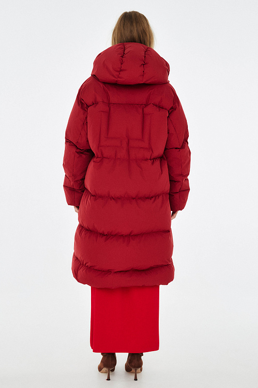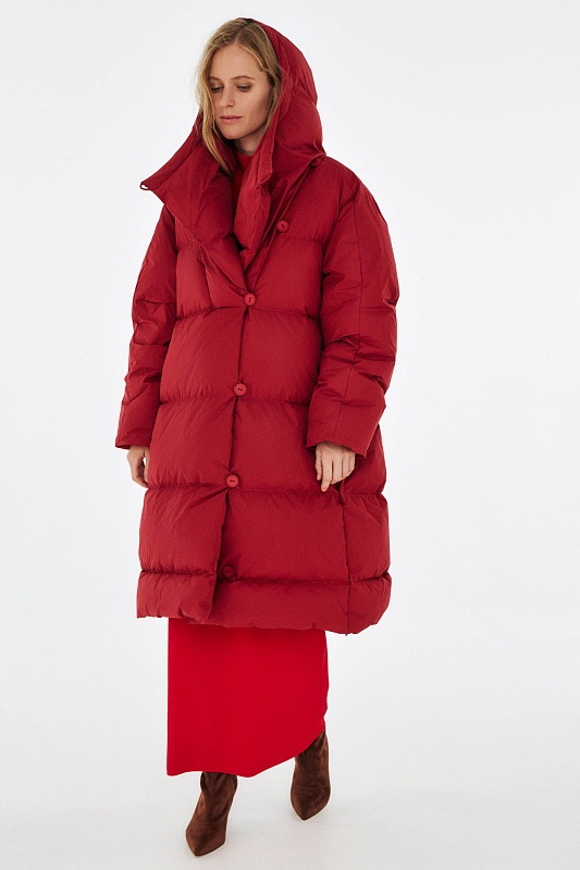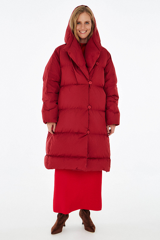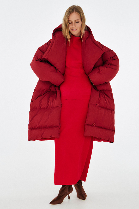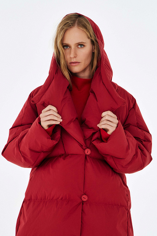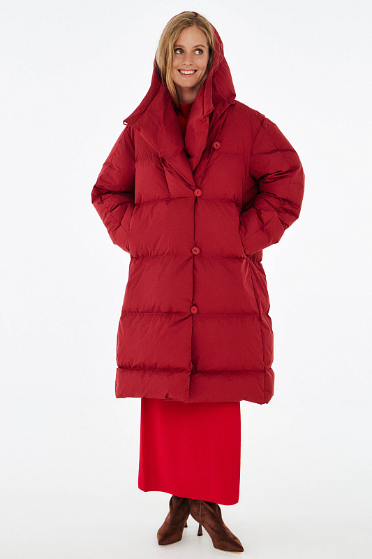Удлиненный пуховик с ассиметричной застежкой на пуговицы. Объемный воротник, переходящий в глубокий капюшон. Выполнен из облегченной водонепроницаемой и одновременно дышащей ткани. За сохранение тепла отвечает отборный гусиный пух с показателем fill power 800. Такой наполнитель позволяет носить пальто при морозах до -25 градусов. Свободный крой и удобные карманы в боковых швах обеспечивают максимальный комфорт. На внутренней стороне вшиты эластичные лямки - резинки, которые при необходимости позволяют не снимать пальто полностью, а просто скидывать с плеч. Внутри рукава предусмотрена резинка, обеспечивающая защиту от поддувания, а по низу - регулируемая кулиска. На спине пуховика эффектная отстрочка в виде логотипа бренда.