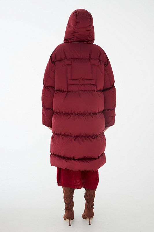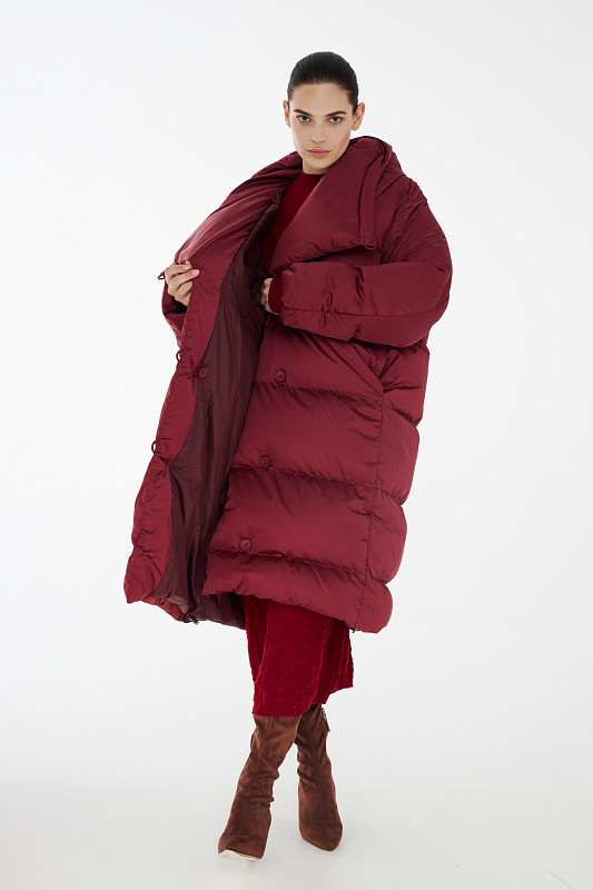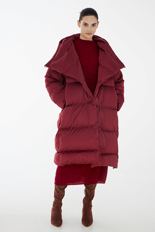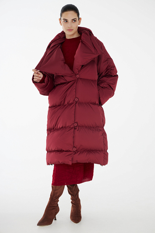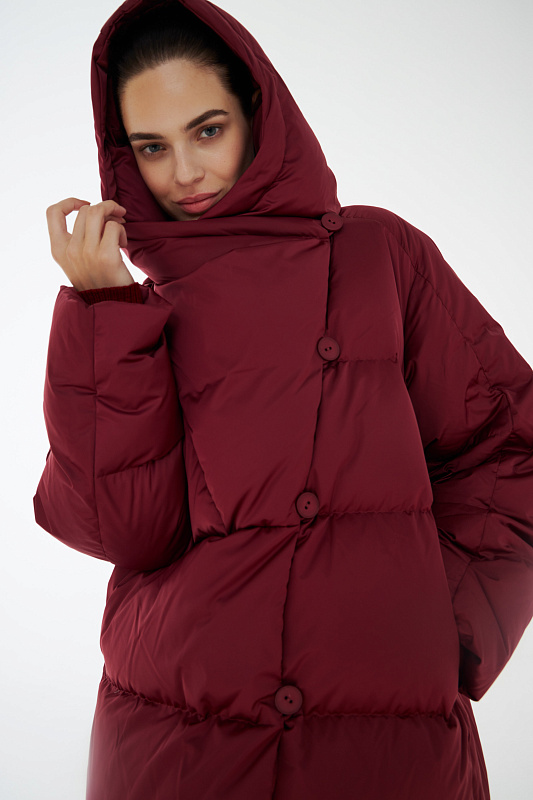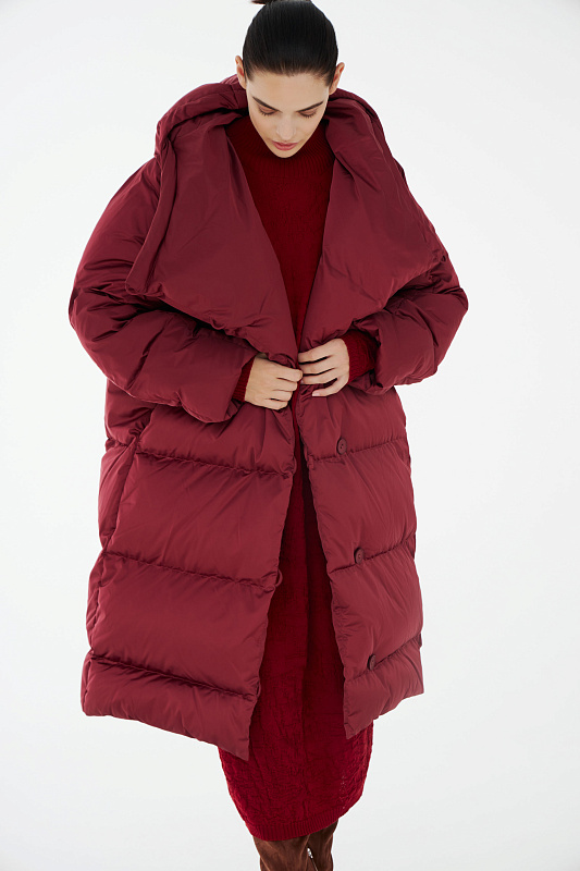 Удлиненный пуховик с ассиметричной застежкой на пуговицы. Объемный воротник, переходящий в глубокий капюшон. Выполнен из облегченной водонепроницаемой и одновременно дышащей ткани. За сохранение тепла отвечает отборный гусиный пух с показателем fill power 800. Такой наполнитель позволяет носить пальто при морозах до -25 градусов. Свободный крой и удобные карманы в боковых швах обеспечивают максимальный комфорт. На внутренней стороне вшиты эластичные лямки - резинки, которые при необходимости позволяют не снимать пальто полностью, а просто скидывать с плеч. Внутри рукава предусмотрена резинка, обеспечивающая защиту от поддувания, а по низу - регулируемая кулиска. На спине пуховика эффектная отстрочка в виде логотипа бренда.