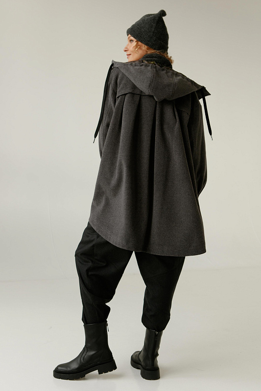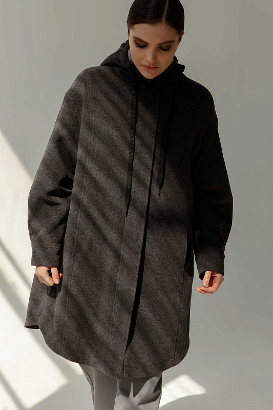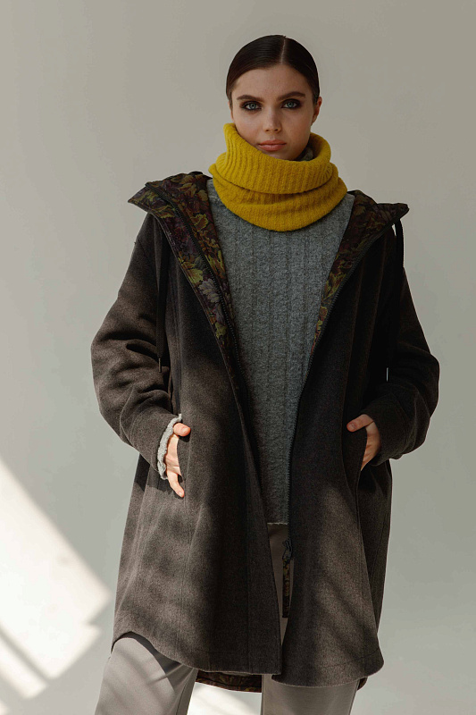 Комфортное пальто средней длины с капюшоном из мягкой ткани на оригинальной комбинированной подкладке. Отрезная кокетка и складки по спинке. Застежка-молния скрыта планкой. Прямая линия борта. Карманы в передне-боковых швах. Рукава на манжетах с пуговицами.