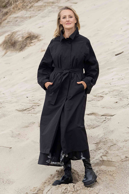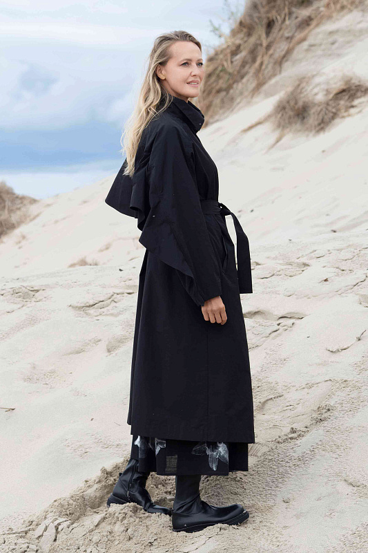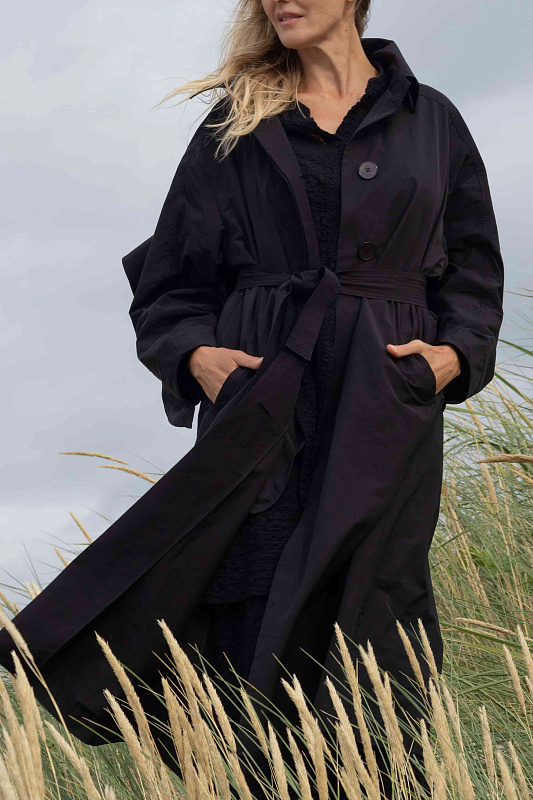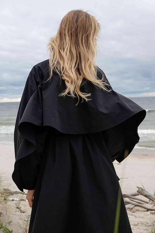 Тренч прямого силуэта благодаря ткани не боится моросящего дождя и защитит от ветра. Дизайнерская находка - это летящая деталь по спинке и рукавам, очень напоминающая крылья. Тренч застегивается на пуговицы, скрытые под планкой. Широким поясом из такой же ткани можно подчеркнуть талию. Тренч без подкладки. Все внутренние швы обработны контрастной отделкой.