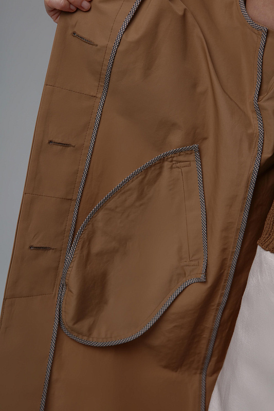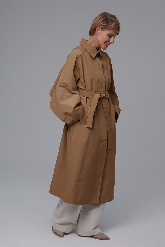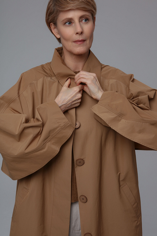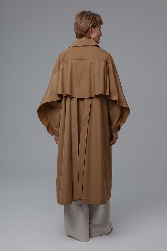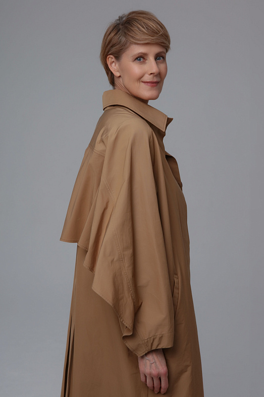 Тренч прямого силуэта благодаря ткани не боится моросящего дождя и защитит от ветра. Дизайнерская находка - это летящая деталь по спинке и рукавам, очень напоминающая крылья. Тренч застегивается на пуговицы, скрытые под планкой. Широким поясом из такой же ткани можно подчеркнуть талию. Тренч без подкладки. Все внутренние швы обработны контрастной отделкой.