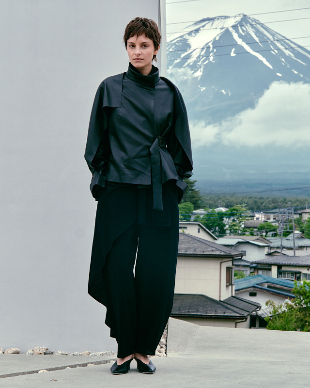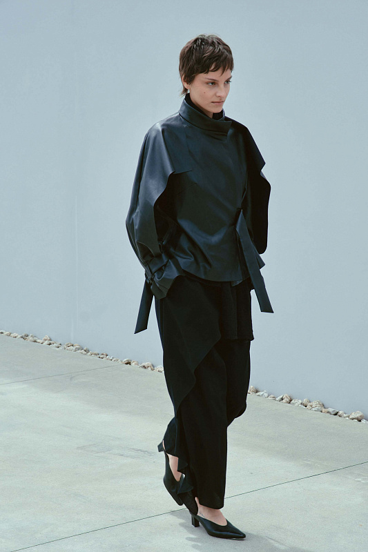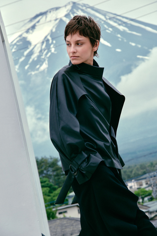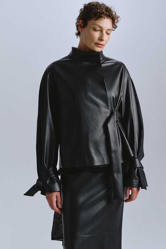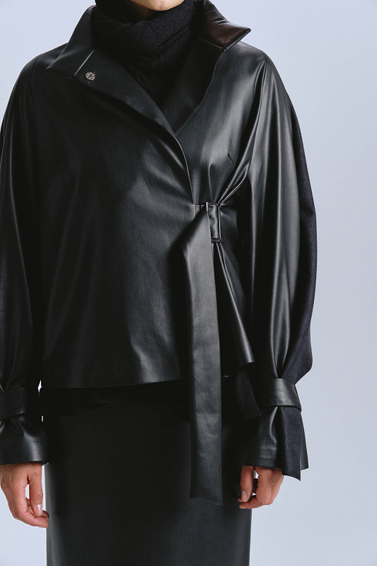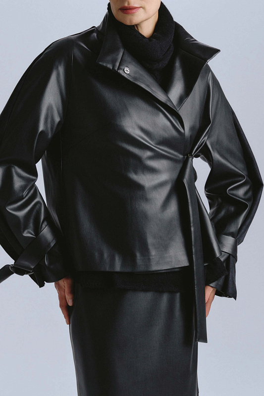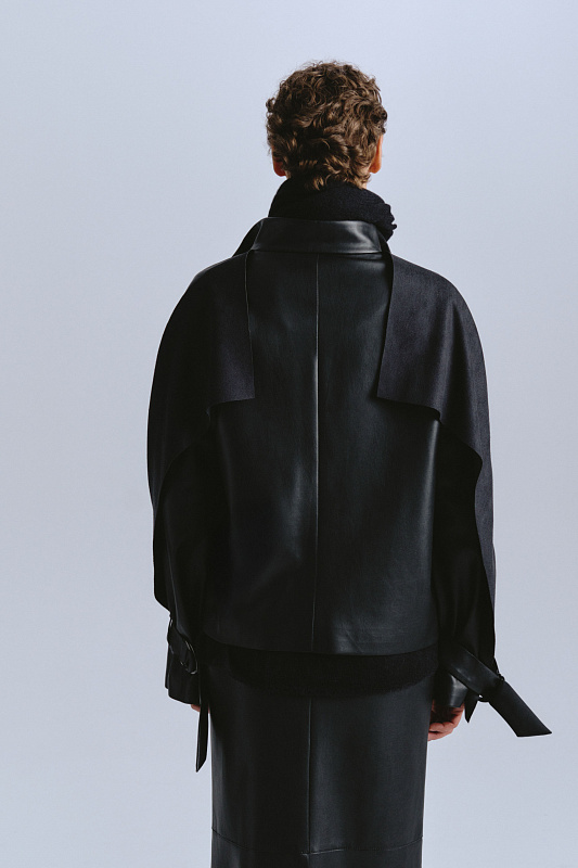 Укороченный кожаный тренч прямого кроя. Полупояс с фиксацией сбоку поможет подчеркнуть талию или отрегулировать объем. Для четкого формирования линии воротника-стойка и дополнительной фиксации в верхней части — застежка-кнопка магнитная. Паты внизу рукава — очень функциональная деталь, позволяет регулировать объем рукава, делая образ более собранным или, наоборот, расслабленным. Ультрамодная модель, в которой на тренч и пелерины указывают стилистические дизайнерские элементы.