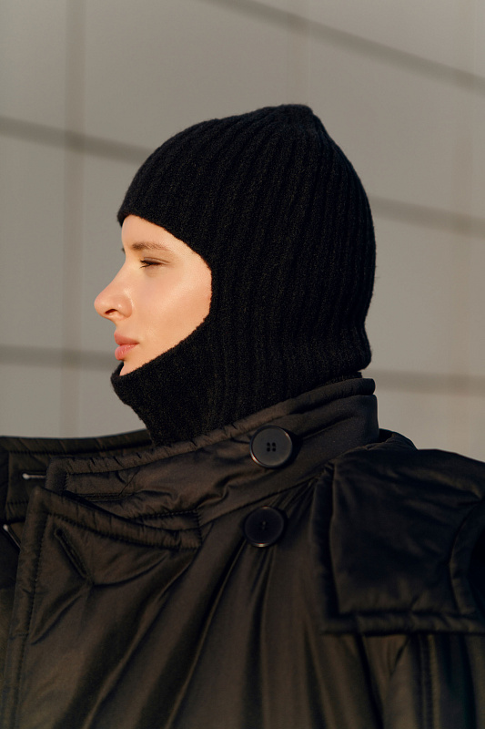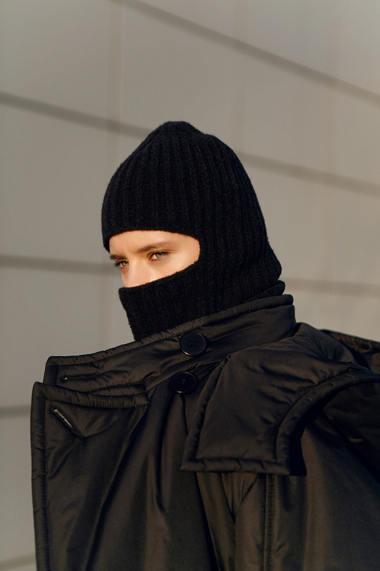 Плотная теплая цельновязанная шапка - Балаклава из тонкой буклированной пряжи выполненная ластичным переплетением.