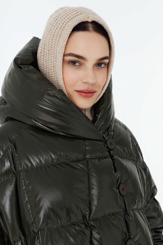 Цельновязаный капор с воротником- манишкой –из пряжи нежнейшей шерсти бэби альпаки и тонкой шерсти мериноса, выполнена объемным переплетением в сочетании с ластичным элементом по линии шеи.