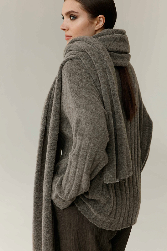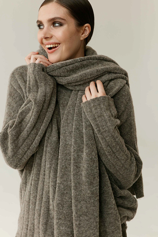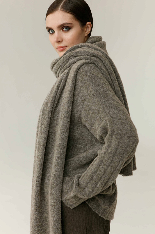 Широкий шарф-палантин из тонкой буклированной пряжи. Выполнен лицевой кулирной гладью. Теплый и уютный аксессуар, придающий образу завершенность.