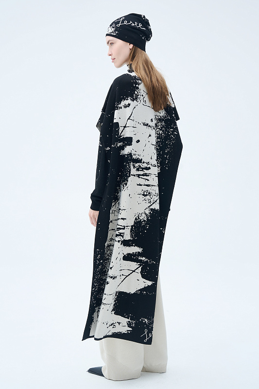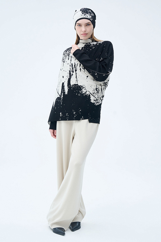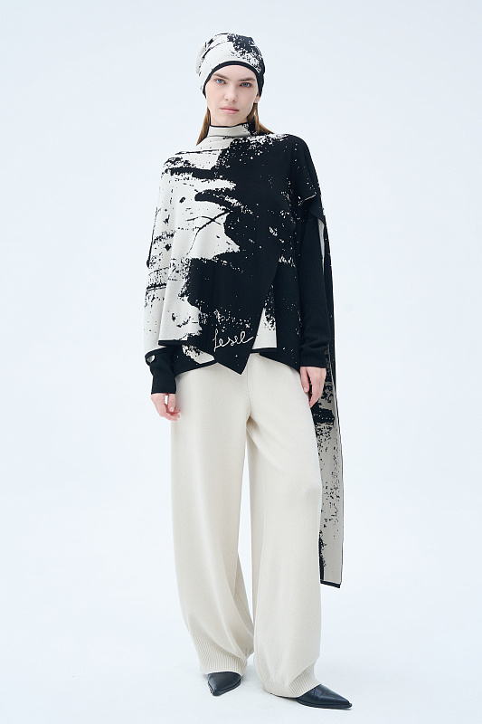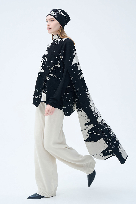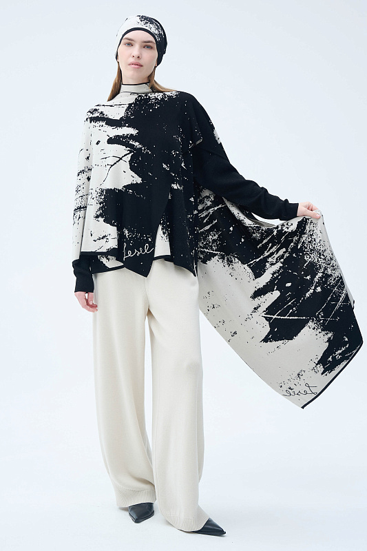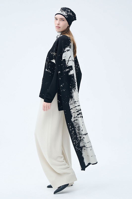 Вязаный гладкий шарф-палантин. Выполнен на контрасте матовой текстуры вискозы с кашемиром и глянцевой вискозы жаккардовым переплетением в виде графического рисунка.