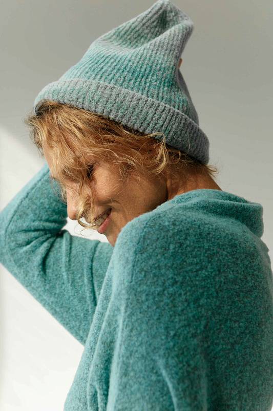 Мягкая шапка из тонкой буклированной пряжи, с небольшим дополнительным объемом. Выполнена в трендовой вязке "рубчик" с эффектом деграде.