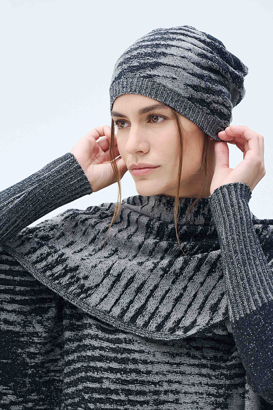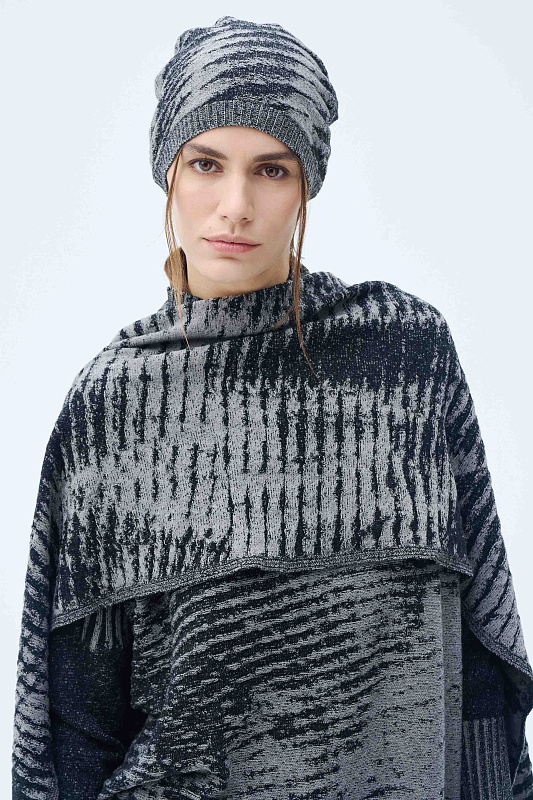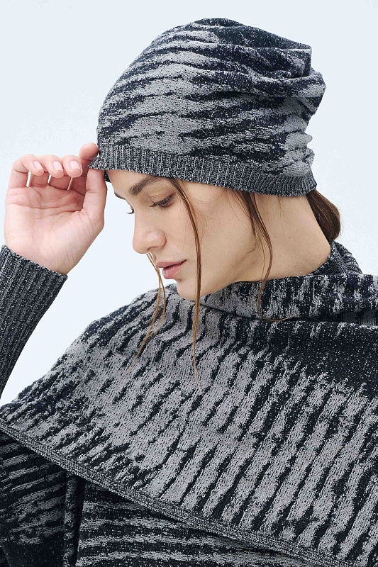 Вязаная шапка из нежной  вискозы с кашемиром.  Выполнена переплетением с абстрактным рисунком. Тонкое полотно делает изделие тактильно приятным.
