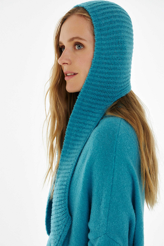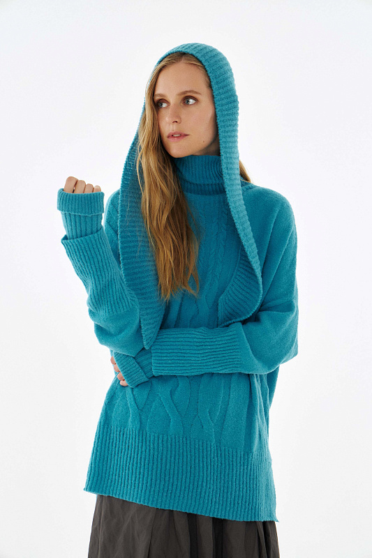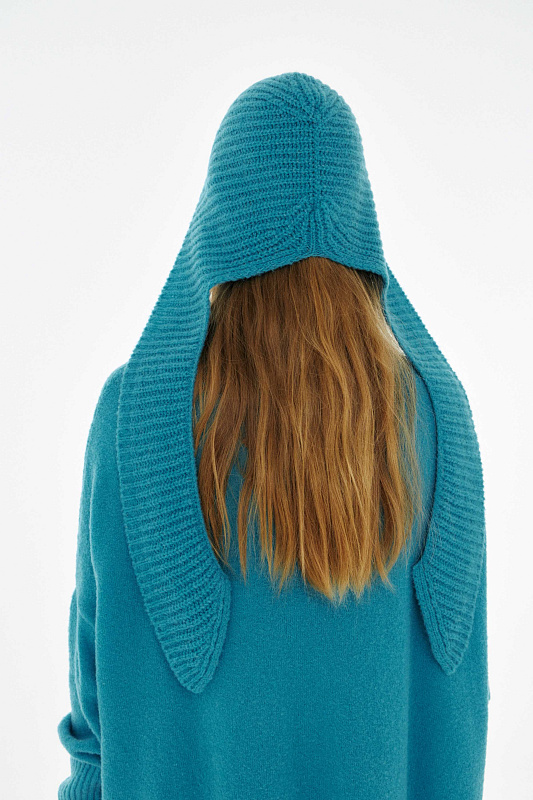 Цельновязанная шапка с ушками из буклированной пряжи  тонкой шерсти мериноса,  выполненная ластичным переплетением.