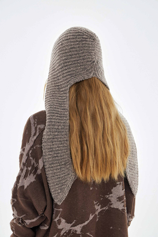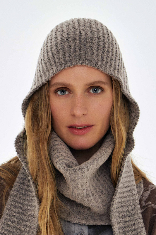 Цельновязанная шапка с ушками из буклированной пряжи  тонкой шерсти мериноса,  выполненная ластичным переплетением.