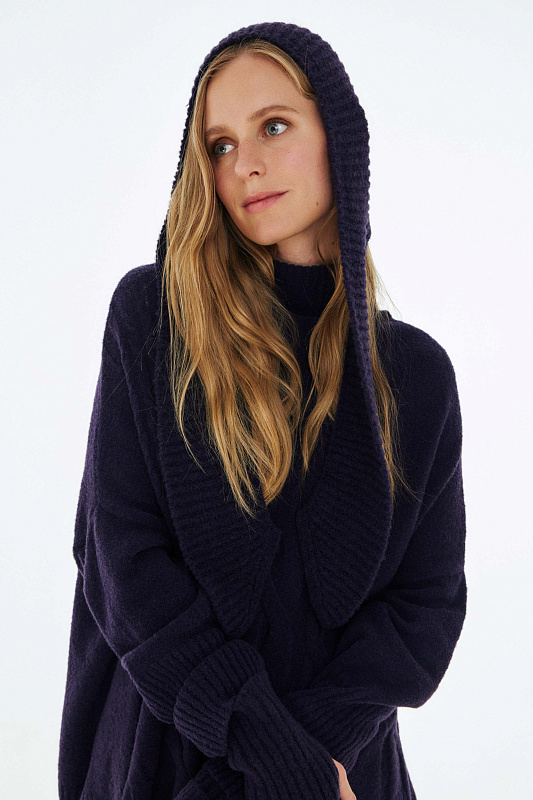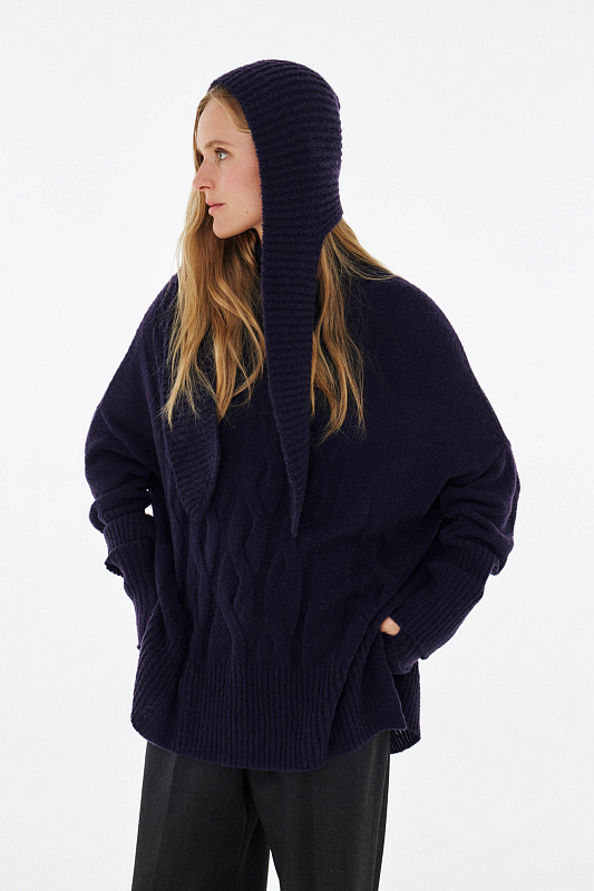 Цельновязанная шапка с ушками из буклированной пряжи  тонкой шерсти мериноса,  выполненная ластичным переплетением.