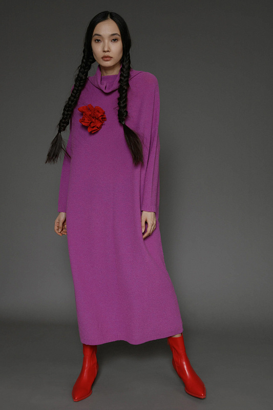 Вязаное длинное  платье из тонкой, мягкой и теплой буклированной пряжи. Выполнено изнаночной кулирной гладью. Спущенная линия плеча, воротник-хомут.