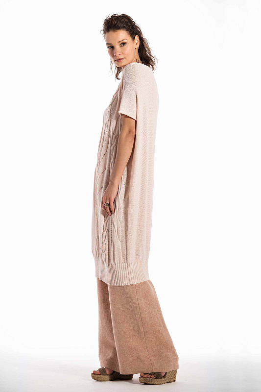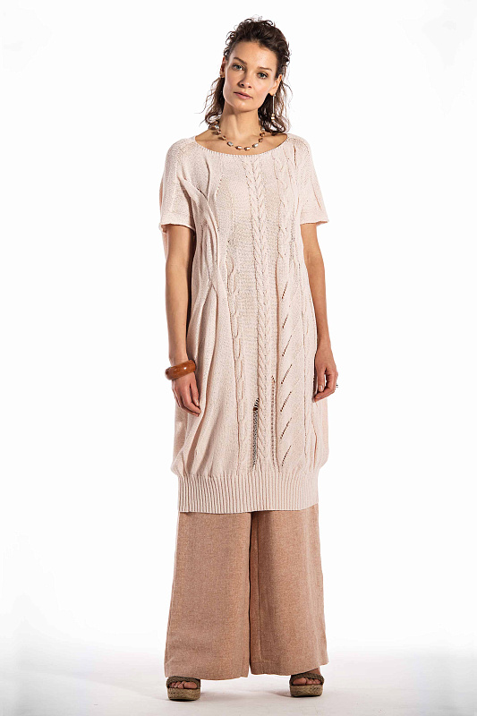 Воздушное вязаное платье. Прямой силуэт, вырез горловины лодочка, короткий рукав, сочетание объемного рисунка Косы с протяжками. Свободное и комфортное платье подчеркнет Вашу женственность и нежность, поможет создать мягкий и неповторимый образ.