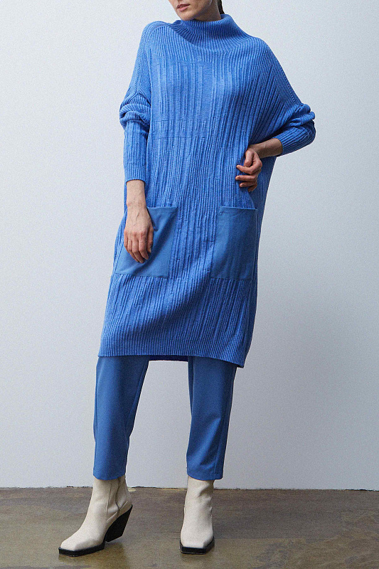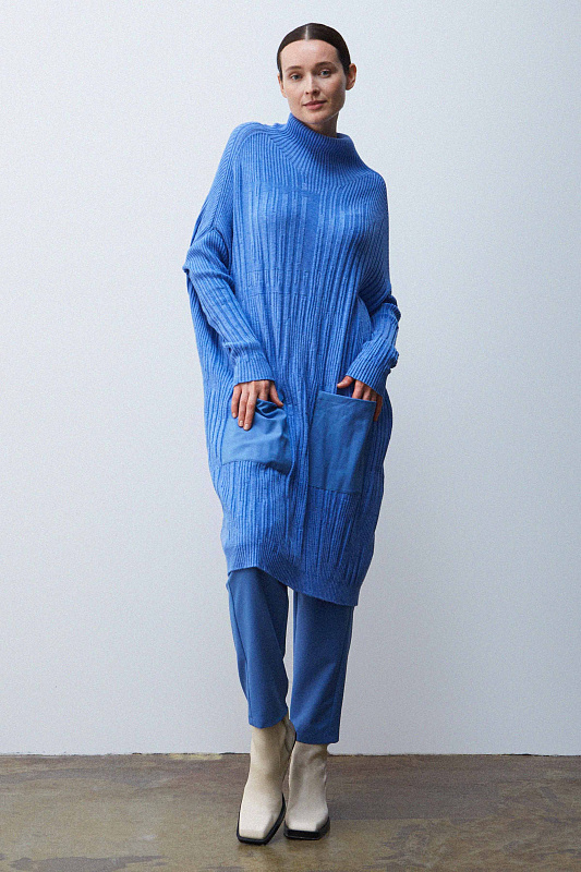Платье прямого силуэта с карманом выполнено из нежной итальянской вискозы с добавлением кашемира. Спущенная линия плеча, воротник-хомут. Джемпер выполнен комбинированным переплетением на базе монорапортного ластика со сбитым ритмом. По рукавам и низу изделия — резинка.