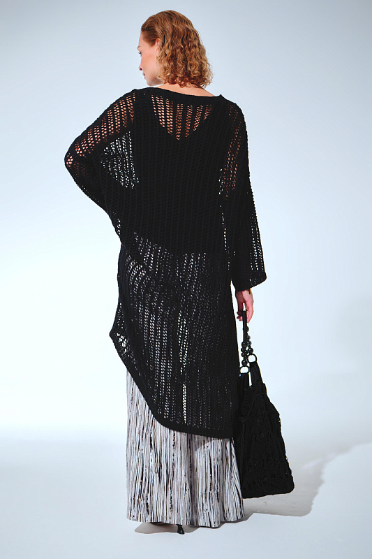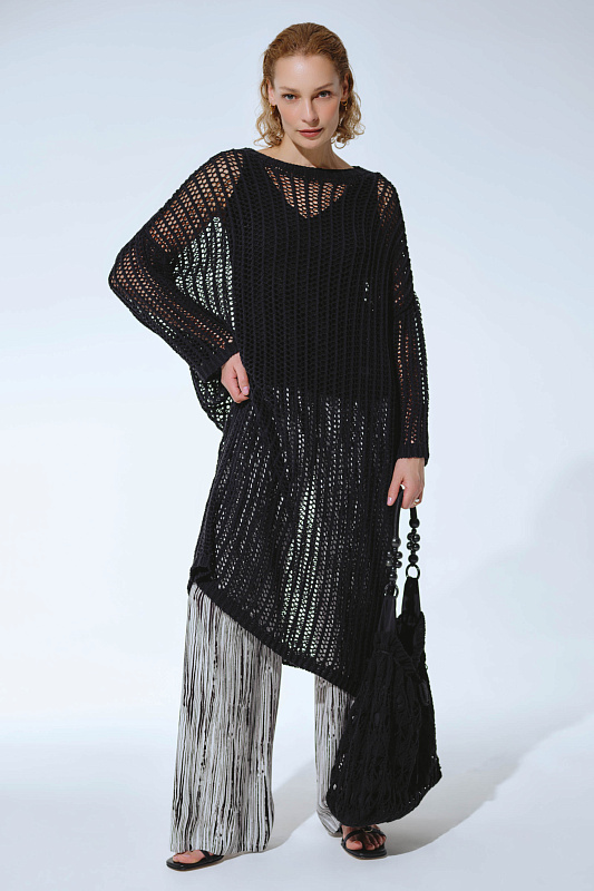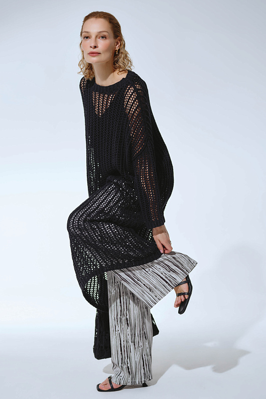 Вязаное платье прямого расслабленного силуэта с длинным рукавом и круглой горловиной. Выполнено из фасонной экологичной итальянской буклированной пряжи со льном из коллекции экологичных пряж. Изысканный вид придает ажурная техника вязания в сочетании с плотной вязкой в виде квадратов.
