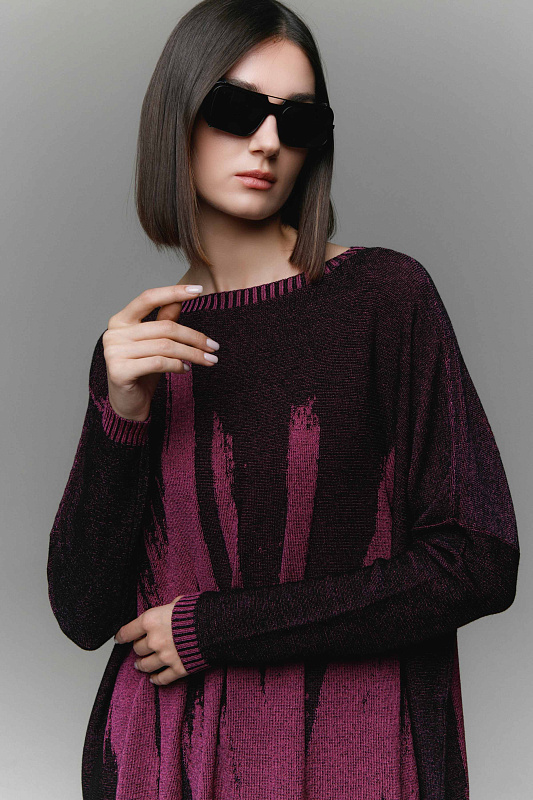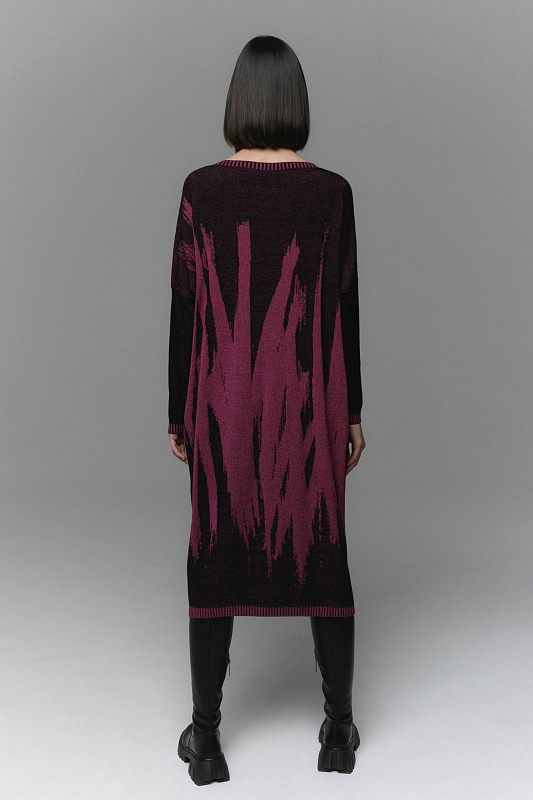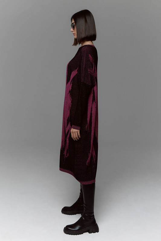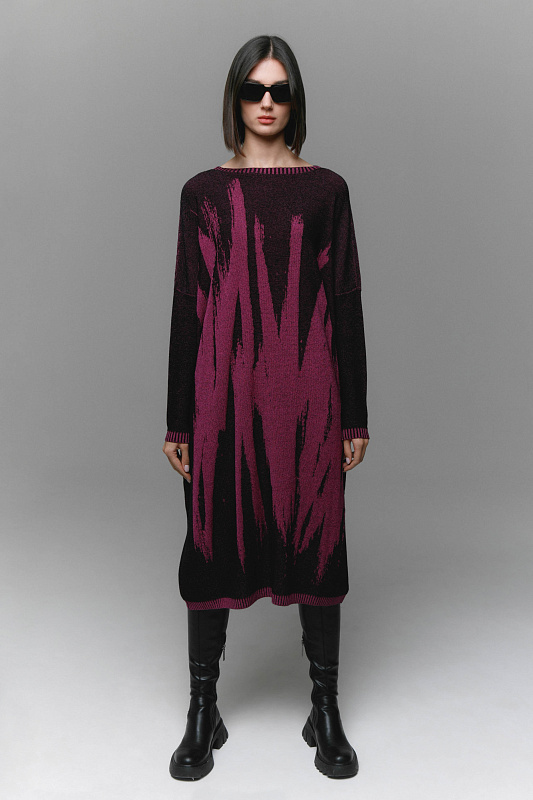 Вязаное платье прямого силуэта с контрастным абстрактным графическим рисунком. Выполнено на контрасте  матовой текстуры вискозы с кашемиром и глянцевой вискозы. Спущенная линия плеча, круглый вырез горловины.
