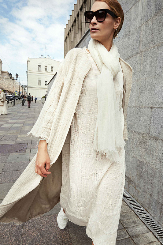Легкое и комфортное платье. Спущенная линия плеча, длинный рукав, вырез горловины лодочка. По рукавам и низу изделия — резинка, рельефный рисунок по полочке, спинке и рукавам. Модель выполнена из нежного итальянского хлопка мако.