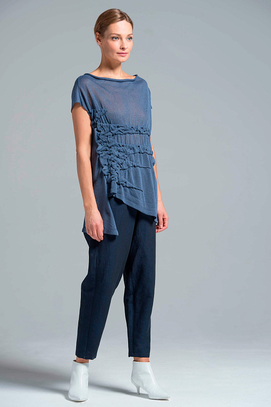 Блуза без рукавов, прямого силуэта, вырез горловины - лодочка, асимметричная линия низа. Соединение сложной объемной фактуры с гладкой  создает уникальный дизайнерский жаккард. Модель выполнена из тонкой и нежной итальянской вискозы.