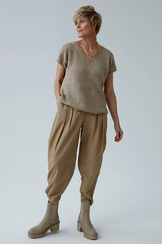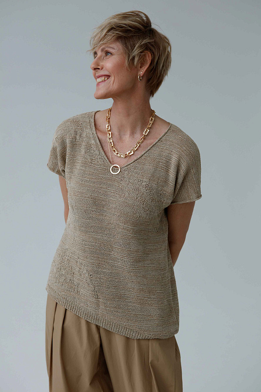 Топ с коротким рукавом и с асимметрией по линии низа.  С текстурным абстрактным рисунком. Короткий рукав, V-образная горловина. Выполнен из итальянской пряжи неравномерного кручения, что придает полотну неоднородную фактуру.