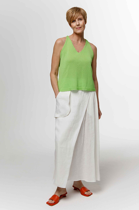 Вязаный топ прямого силуэта на тонких бретелях, соединенных на спинке за счёт декоративного металлического кольца. Рекомендуем снимать кольцо перед стиркой изделия. Элемент по спинке придает топу спортивного шика. Модель выполнена из тонкой и нежной Итальянской вискозы с мерцающим блеском.