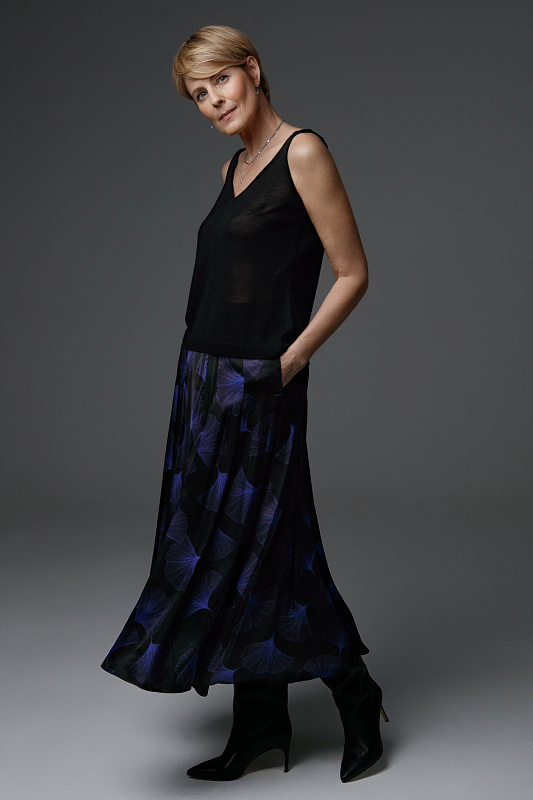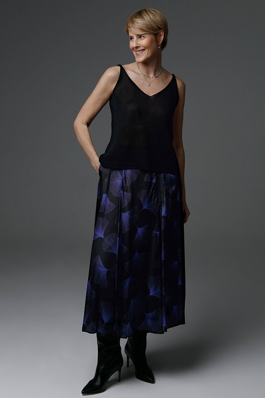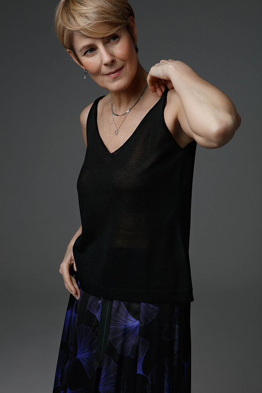 Оригинальный топ прямого силуэта с перекрученными бретелями. Полупрозрачное струящееся полотно. Модель выполнена из тонкой и нежной Итальянской вискозы с мерцающим блеском.