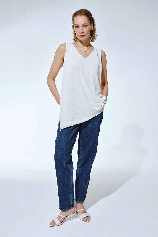 Выполнен из тонкого полотна с асимметричным разрезом по боковому шву и текстурным рисунком по стану изделия.
