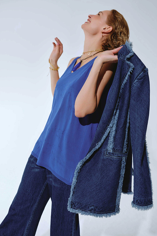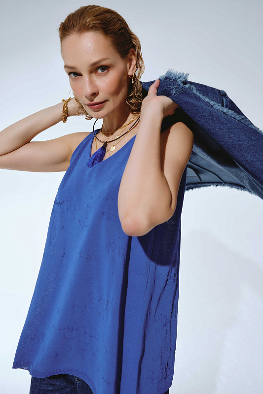 Выполнен из тонкого полотна с асимметричным разрезом по боковому шву и текстурным рисунком по стану изделия.
