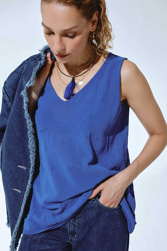 Удлиненный вязаный топ полуприлегающего силуэта с V- образной горловиной.