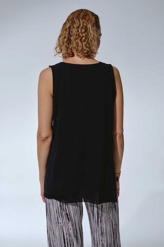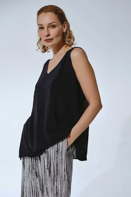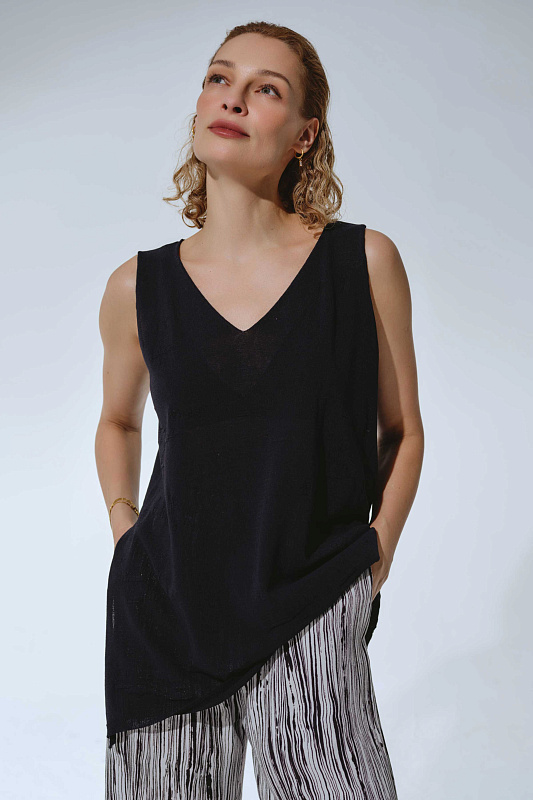 Удлиненный вязаный топ полуприлегающего силуэта с V- образной горловиной.