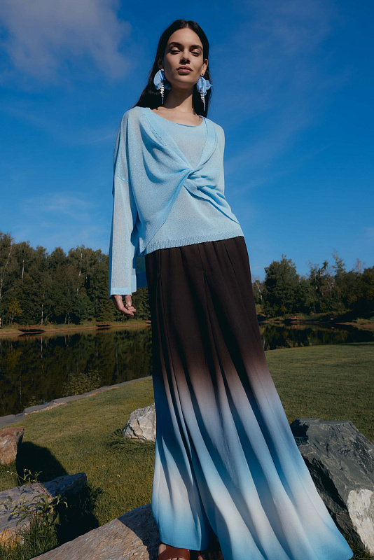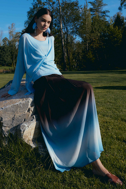 Юбка-клеш из струящейся вискозы создает женственный, грациозный силуэт. Заложенные в пояс-резинку складки добавляют динамики, превращая простую юбку в произведение модного искусства. Пояс-резинка мягко облегает талию, юбка садится «как влитая» и не требует постоянной корректировки. Вместительные карманы — не просто декор, это комфорт и удобство. Скрытый крой карманов не добавляет лишнего объема, сохраняя чистоту линий. Юбка выполнена из ткани с эффектом деграде — плавные переходы цвета создают неповторимые визуальные эффекты. Юбка-клеш со складками — не просто одежда, а настроение, которое Вы создаете сами.