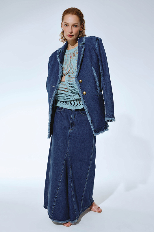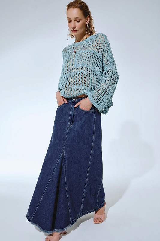 Расклешенная джинсовая юбка-макси выполнена из прочного денима. Эта модель отлично подойдет, как для повседневного, так и для нарядного образа. Карманы сзади подчеркнуты вышивкой в виде логотипа бренда. Варка придает ткани так актуальный сейчас «винтажный» эффект, образуя естественные заломы и потертости. Особый акцент- клинья с необработанными краями.