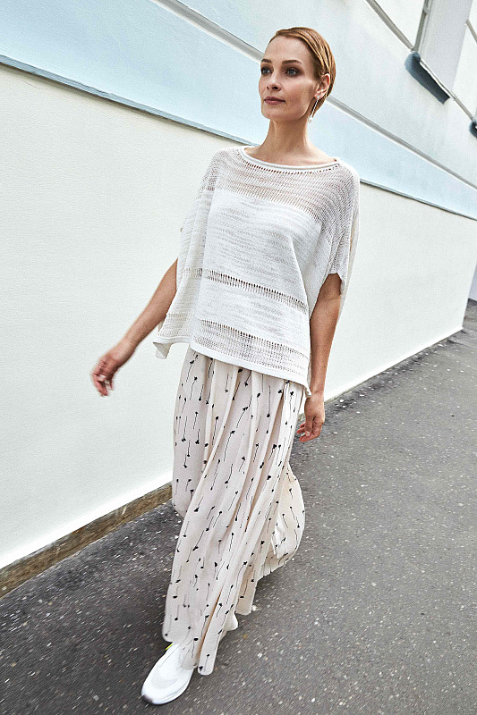 Юбка восьмиклинка длинная, на подкладке, со складками в швах. Пояс на резинке, карманы в шве. Модель выполнена из нежной и струящейся вискозы с мелким цветочным принтом.