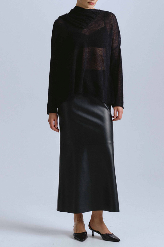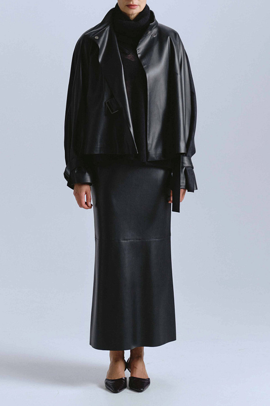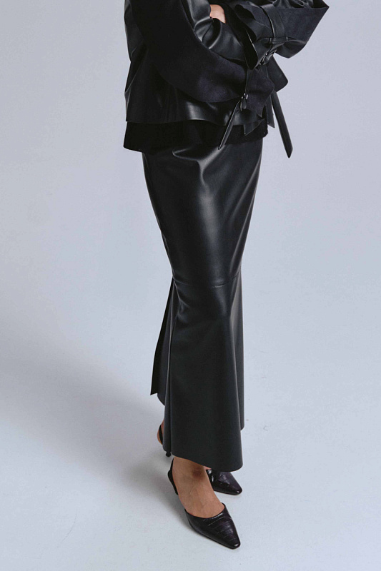 Юбка выполнена из экокожи исключительного качества, она впечатляет своей гладкостью и мягким люксовым блеском. Прямой силуэт вне времени, подчеркивает вертикаль и строгость. Длина универсальная — миди. Отсутствие традиционного пояса — это дизайнерское решение! Тонкая резинка для безупречной посадки, а потайная молния для удобства надевания. Внимание к комфорту — шлица сзади для свободы шага. Необработанный низ демонстрирует структуру материала. По окружности проходит центральная дизайнерская строчка. Она создает игру света и неожиданную динамику статичного прямого силуэта. Каждая деталь юбки продумана до мелочей и несет смысл.
