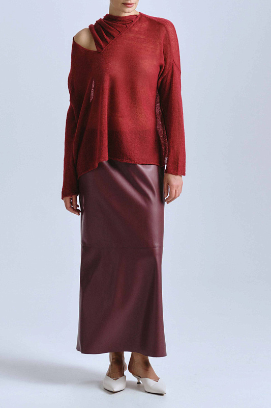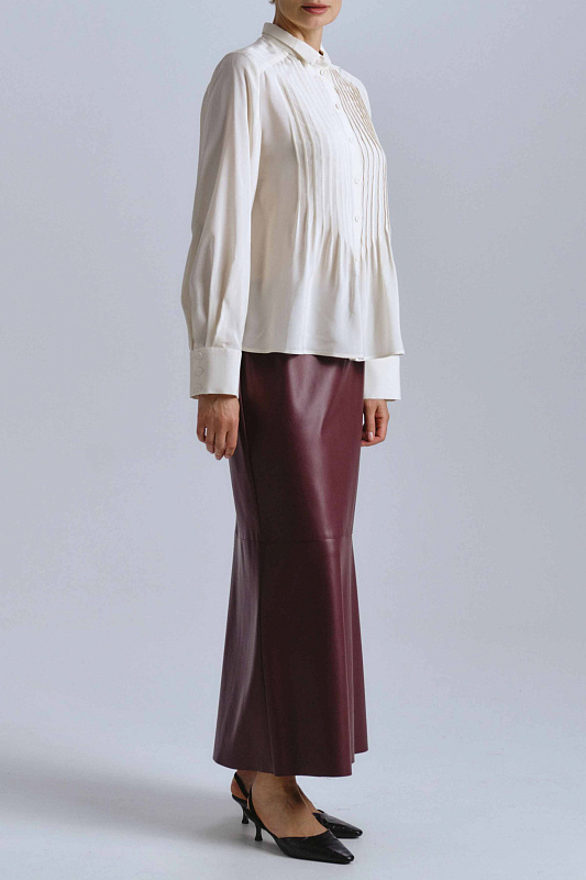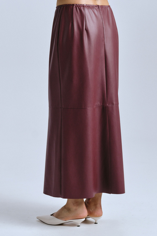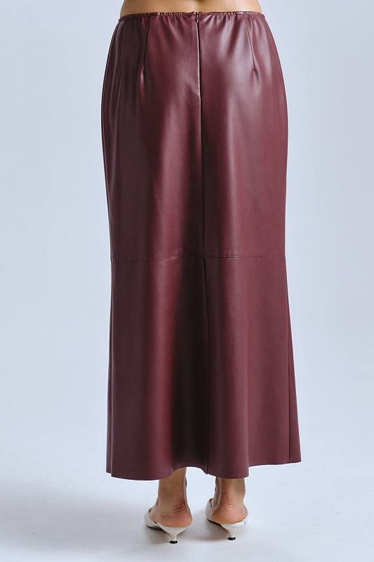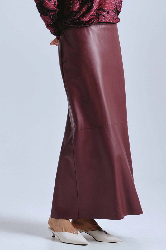 Юбка выполнена из экокожи исключительного качества, она впечатляет своей гладкостью и мягким люксовым блеском. Прямой силуэт вне времени, подчеркивает вертикаль и строгость. Длина универсальная — миди. Отсутствие традиционного пояса — это дизайнерское решение! Тонкая резинка для безупречной посадки, а потайная молния для удобства надевания. Внимание к комфорту — шлица сзади для свободы шага. Необработанный низ демонстрирует структуру материала. По окружности проходит центральная дизайнерская строчка. Она создает игру света и неожиданную динамику статичного прямого силуэта. Каждая деталь юбки продумана до мелочей и несет смысл.