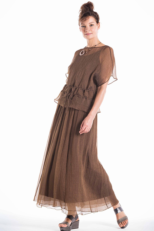 Длинная, легкая, многослойная юбка, жатка-вуаль. На переднем полотнище мелкие мягкие складочки, пояс на резинке. Длина по боковому шву  около 100 см.