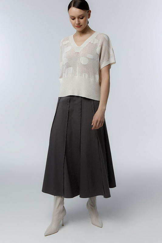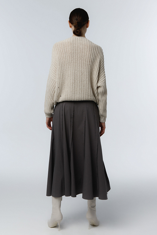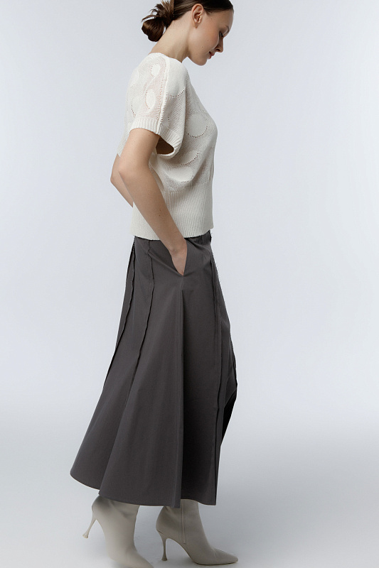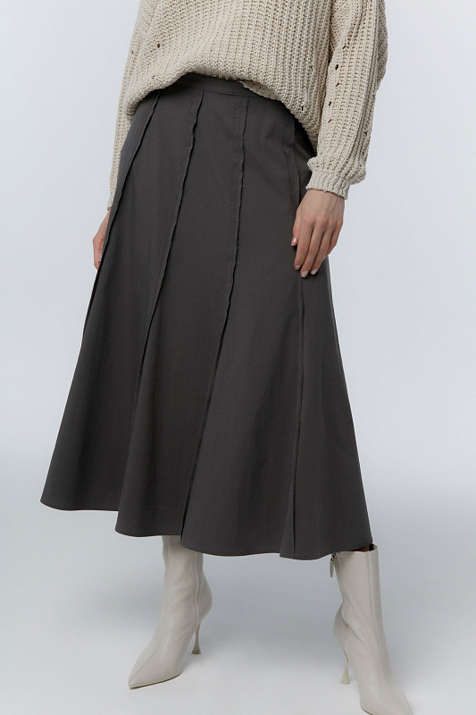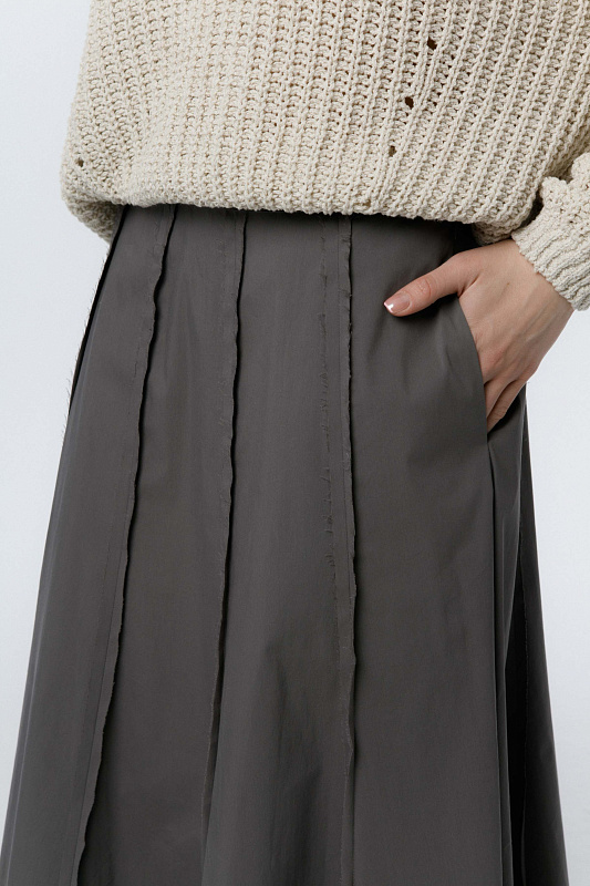 Оригинальная юбка струящегося А-силуэта. Особую стилистику гранж придают модели необработанные швы на клиньях. Тонкий пояс с деликатной резинкой, застежка сбоку на молнии и пуговичке. Карманы в боковых швах.