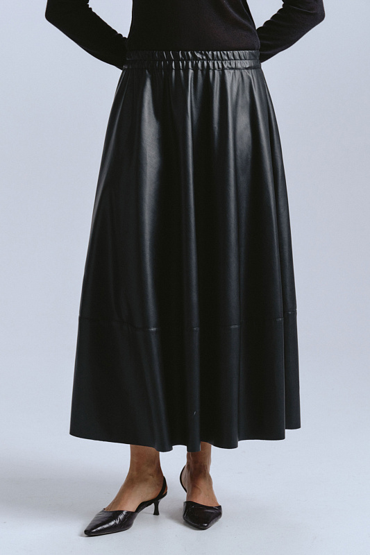 Юбка выполнена из роскошной экокожи, мягкой фактуры и с благородным приглушенным блеском. Клеш — очень динамичный и женственный крой, а длина миди — синоним универсальности. Необработанный низ — сознательный модный ход, подчеркивающий качество материала. Пояс юбки — плотная двойная резинка, а для удобства надевания — молния и пуговица. В 20 см от низа юбки проходит горизонтальная строчка и выдает дизайнерский подход к крою! Нижняя деталь создает ромбовидную форму. Эта юбка станет жемчужиной вашего гардероба.