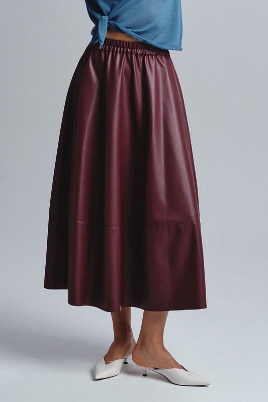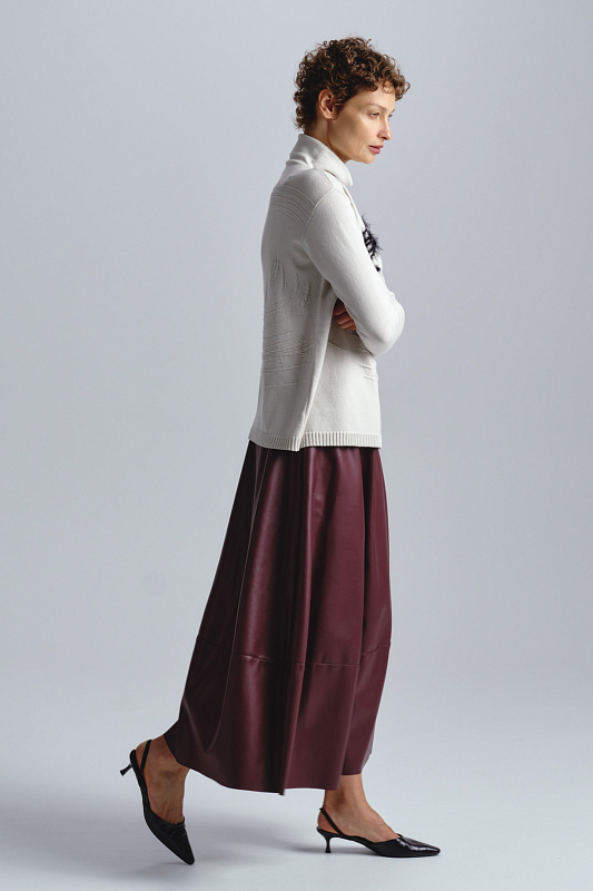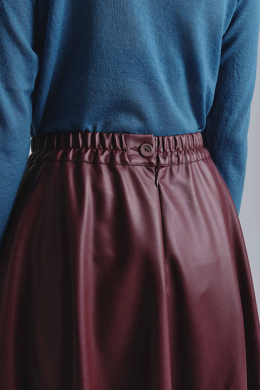 Юбка выполнена из роскошной экокожи, мягкой фактуры и с благородным приглушенным блеском. Клеш — очень динамичный и женственный крой, а длина миди — синоним универсальности. Необработанный низ — сознательный модный ход, подчеркивающий качество материала. Пояс юбки — плотная двойная резинка, а для удобства надевания — молния и пуговица. В 20 см от низа юбки проходит горизонтальная строчка и выдает дизайнерский подход к крою! Нижняя деталь создает ромбовидную форму. Эта юбка станет жемчужиной вашего гардероба.