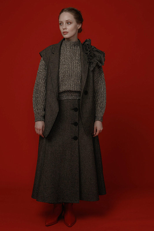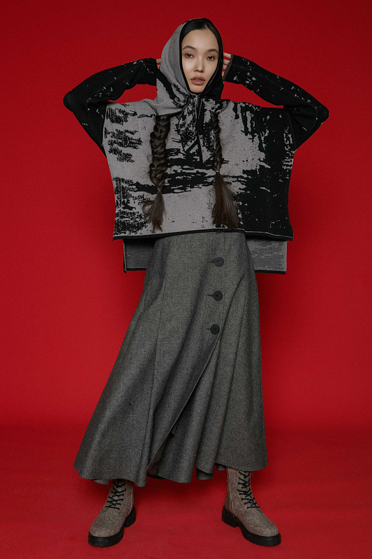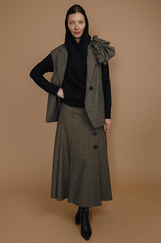 Юбка оригинальной дизайнерской конструкции с высокой посадкой силуэта клеш. Ассиметричная застежка на большие пуговицы выгодно подчеркивает линию талии. Сзади - комфортный пояс на резинке. Глубокие вертикальные складки придают юбке динамичность. Предусмотрены удобные карманы в боковых швах. Приятная к телу подкладка. Универсальная длина позволяет носить ее с обувью на каблуке, либо на плоской подошве.