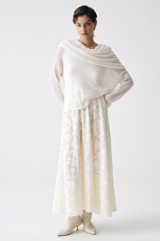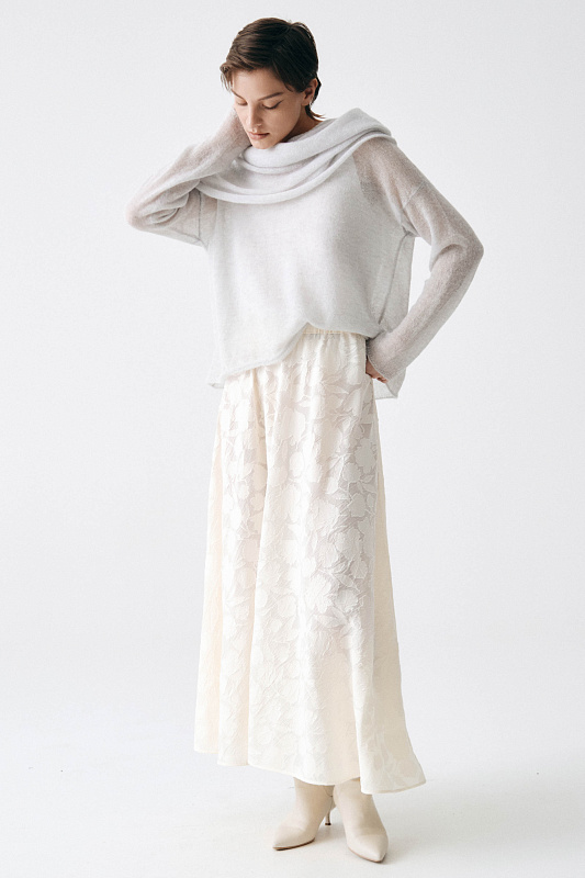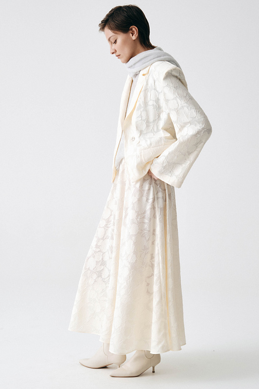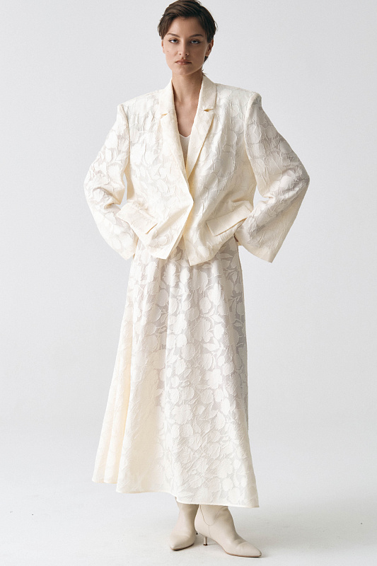 Юбка макси — выверенный акцент в вашей капсуле. Модель сконструирована из воздушной полупрозрачной ткани с россыпью цветов, создающих выразительный объемный эффект. Подкладка по всей длине юбки освобождает вас от необходимости думать о белье и позволяет ткани парить вокруг силуэта. Пояс на резинке - это не только продуманная, функциональная деталь, но и дизайнерский прием создающий дополнительную легкость. Монохром на пике моды, поэтому идеальный total look это сочетание юбки и жакета артикул 2526002