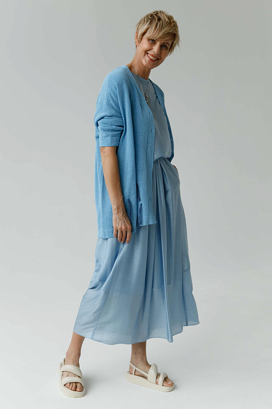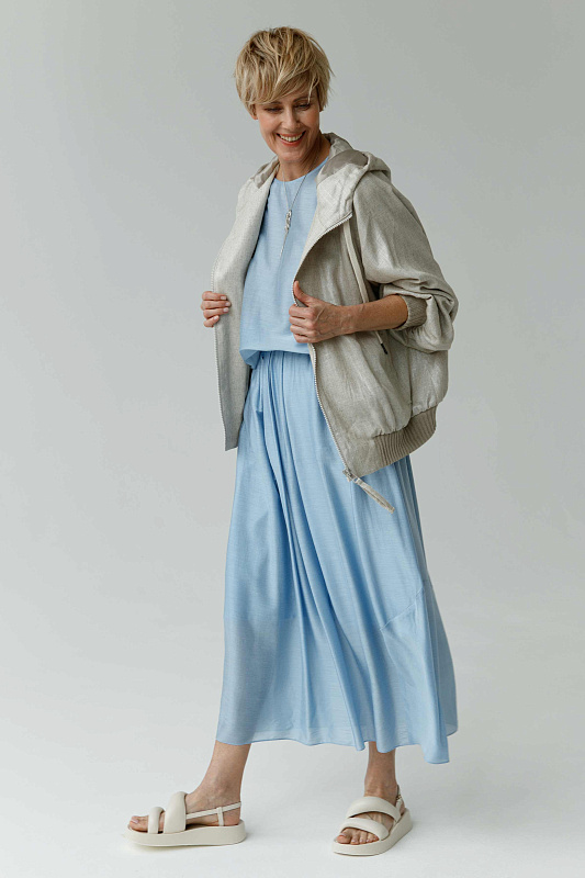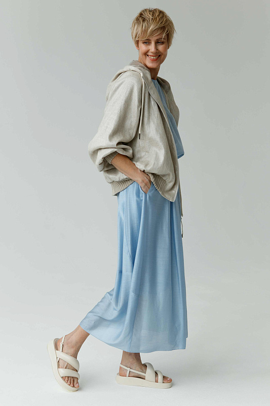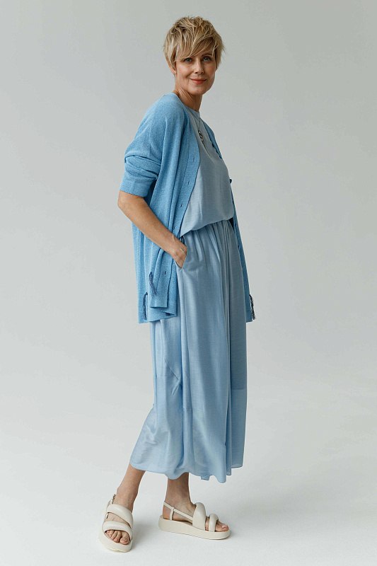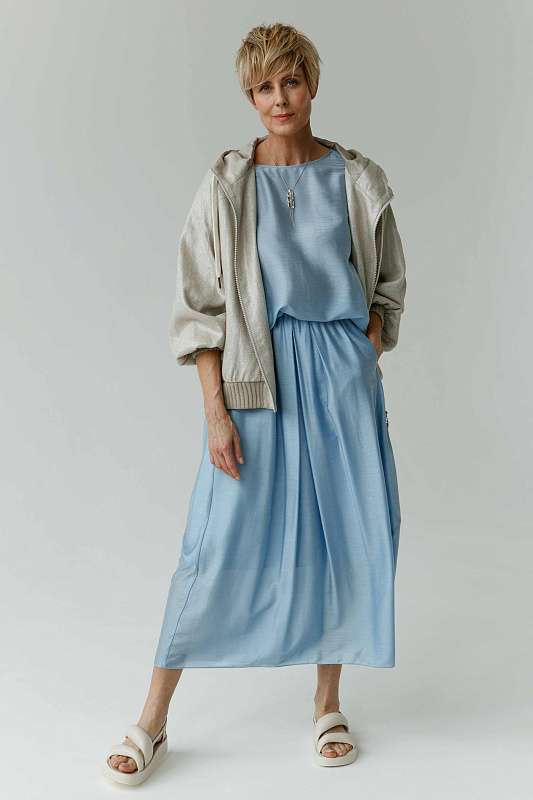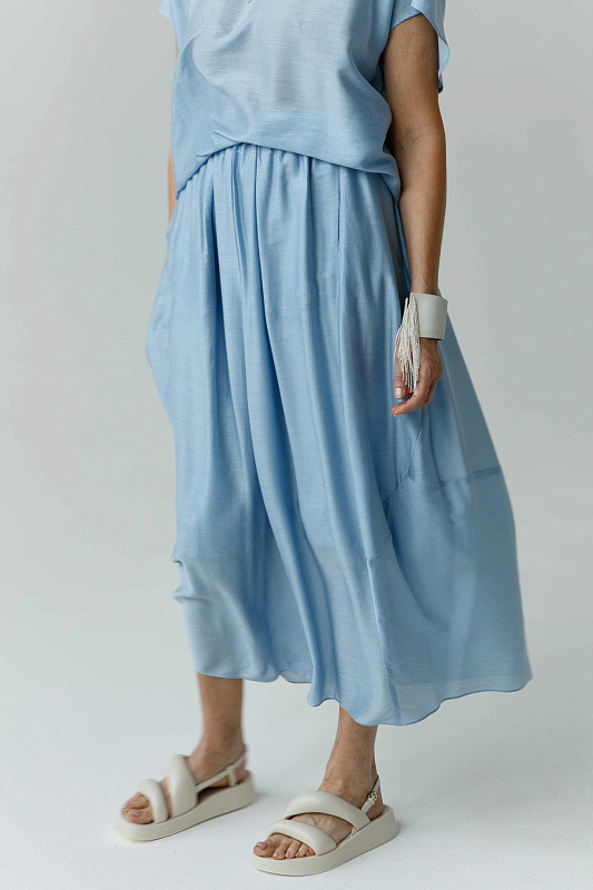 Идеальная воздушная юбка из микромодала с добавлением шелка оригинальной дизайнерской конструкции. Пояс на резинке. Два удобных кармана. Легкая подкладка.