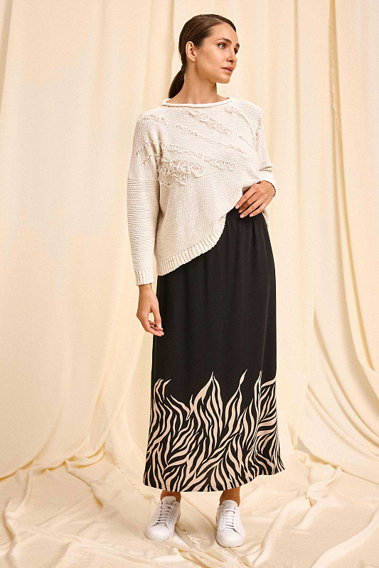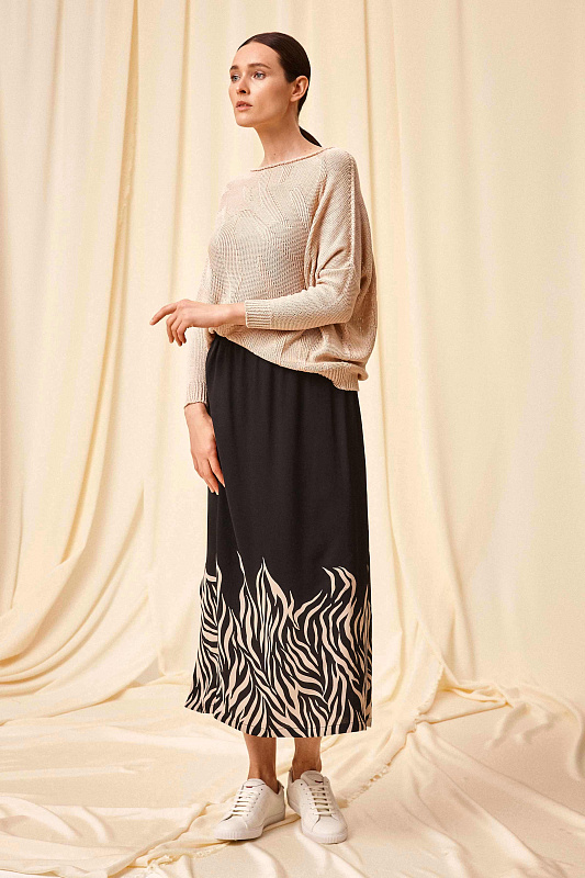Эффектная вискозная юбка на поясе с резинкой,  с разрезами в боковых швах. Оригинальный принт в виде языков пламени. Молния сзади. Подкладка - нежнейшая вискоза.