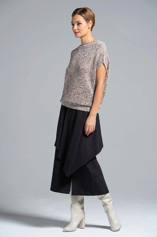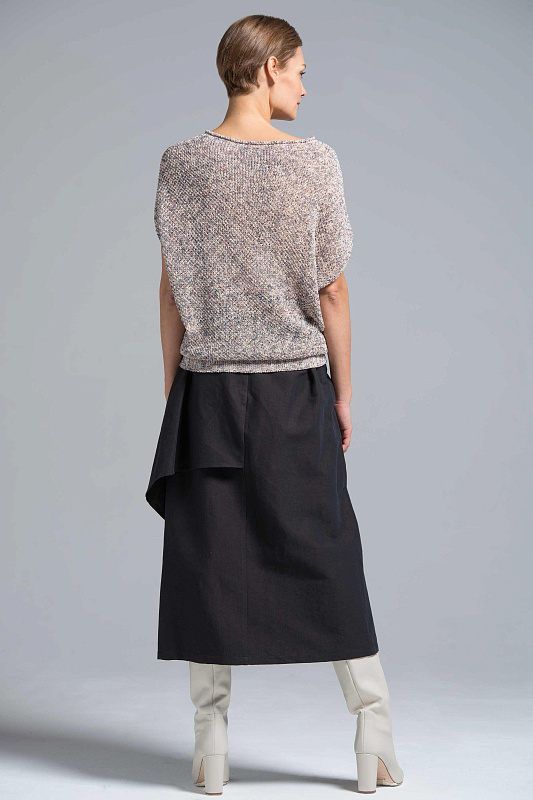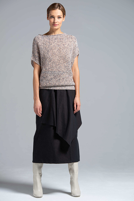 Прямая юбка с оригинальным клином асимметрией и неглубоким разрезом по переду, полуприлегающий силуэт, средней длины. Пояс на пуговице и резинке с небольшими сборками. Застегивается на потайную молнию. Ткань мягкий и экологичный лен с небольшим содержанием эластана, придающего свободу движению.