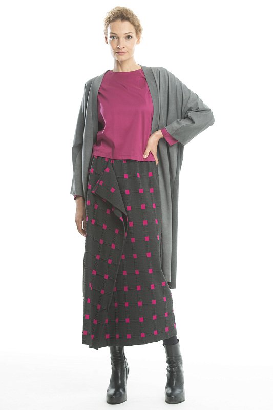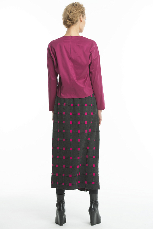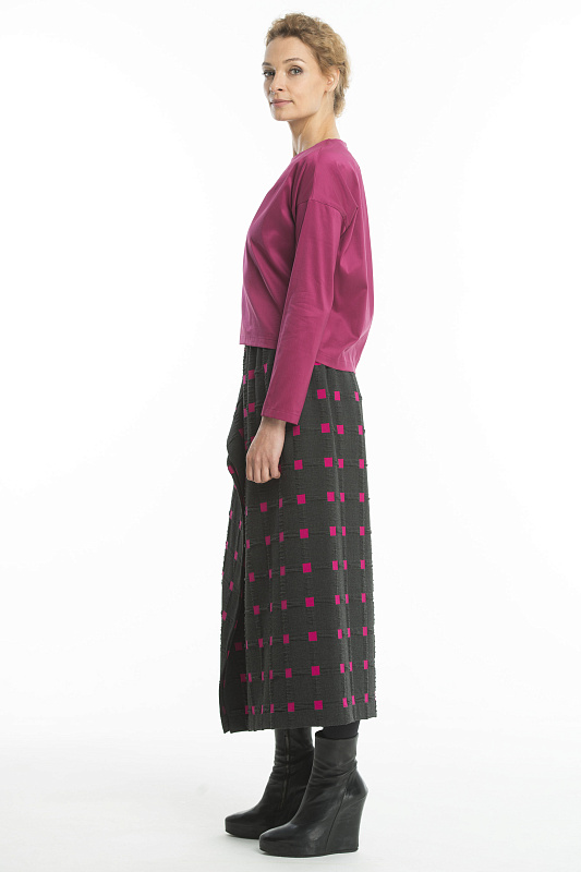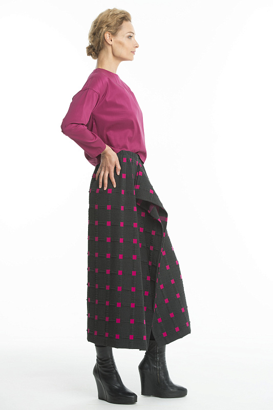 Прямая мягкая юбка с вертикальным воланом. Впереди рельефная линия стачного волана слегка смещена вправо. Пояс на резинке.