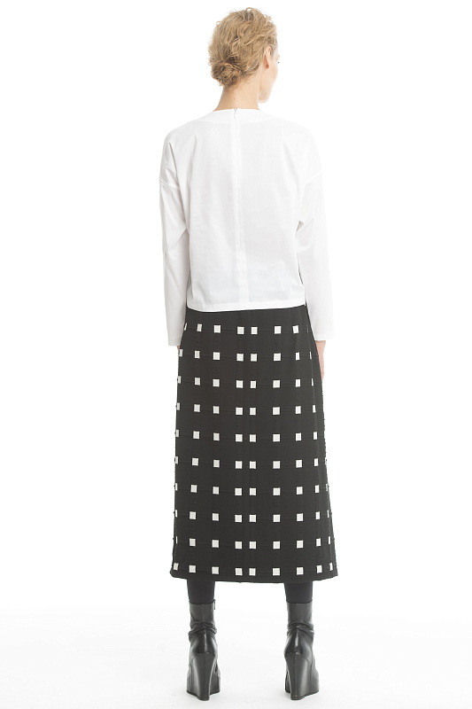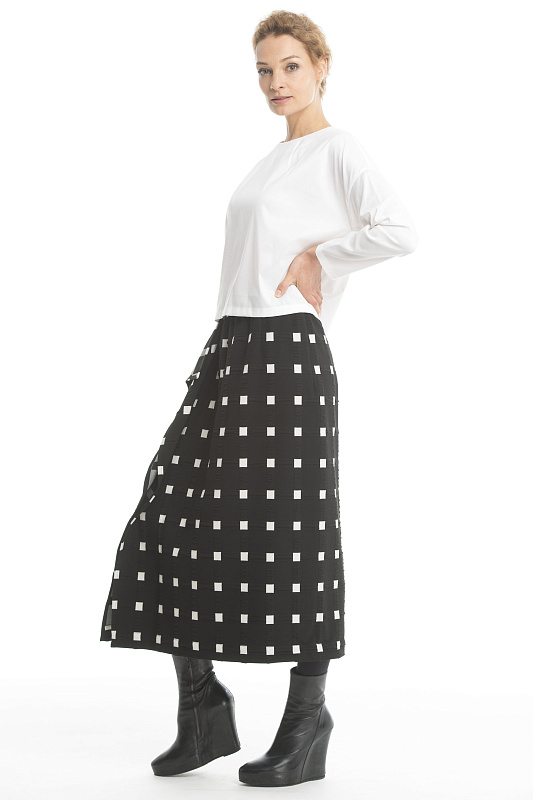 Прямая мягкая юбка с вертикальным воланом. Впереди рельефная линия стачного волана слегка смещена вправо. Пояс на резинке.