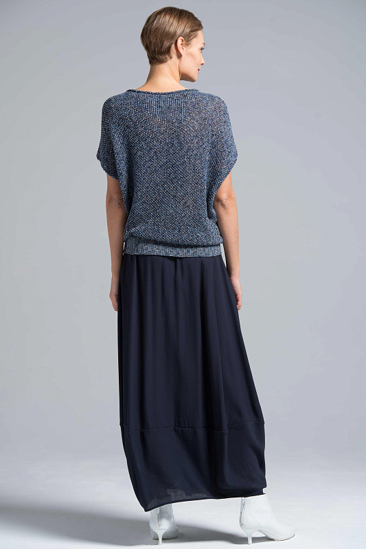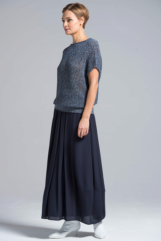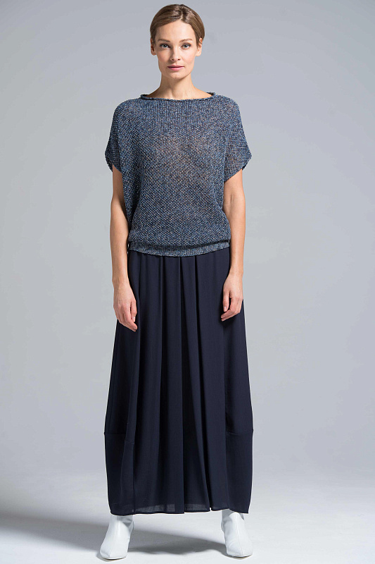 Длинная юбка, силуэт тюльпан, сложной авторской конструкции с вертикальными рельефами. Юбка с карманами в шве, со встречными ниспадающими складками по переду, на резинке из креповой вискозы просто завораживающей необычайной легкостью и невесомостью. Зернистая поверхность тканевого полотна, достигается благодаря особому плетению ткани, придавая ей необыкновенную красоту и изящность. Длина изделия 97 см.