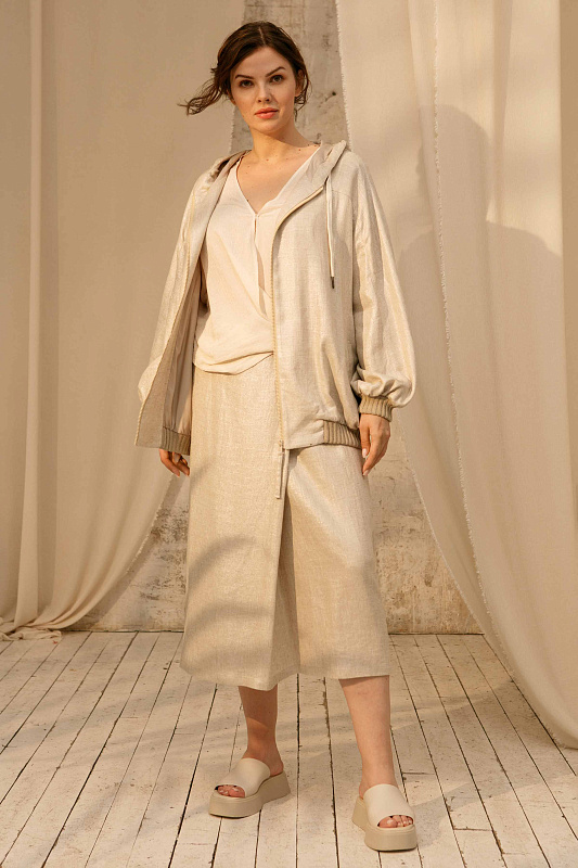 Прямая юбка средней длины с запахом. Пояс на резинке, сзади скрытая молния. Карманы в боковых швах. Модель выполнена изо льна с очень деликатным блеском. Подкладка - нежнейшая вискоза. .