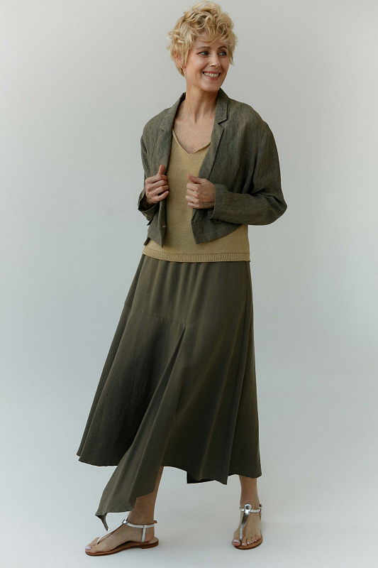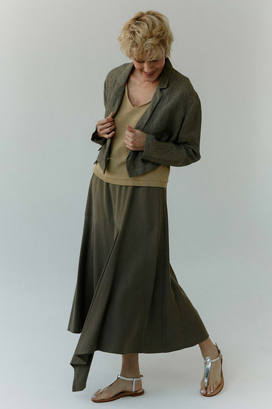 Юбка асимметрия-клеш сложной авторской конструкции. Внутришовные карманы, пояс на резинке. Модель выполнена из уникальной ткани нового поколения – тенсель, – экологически чистого, очень прочного, дышащего и не вызывающего аллергию материала, который изготавливают из древесины австралийского эвкалипта.