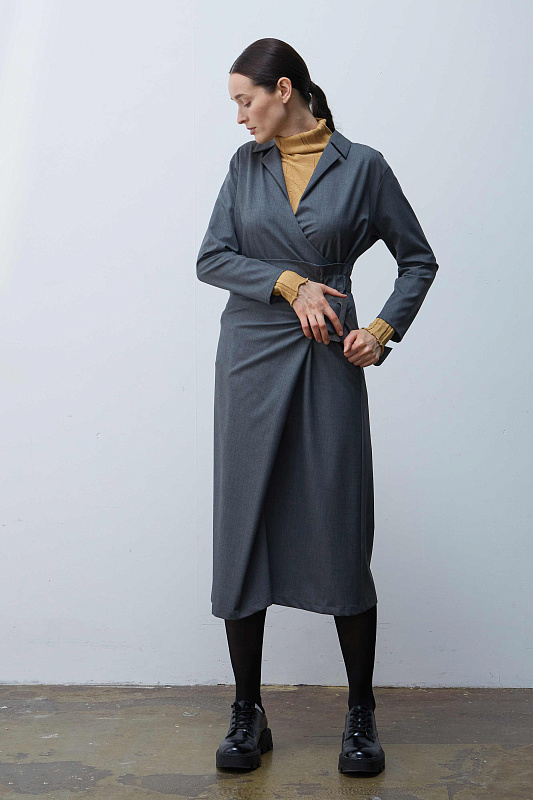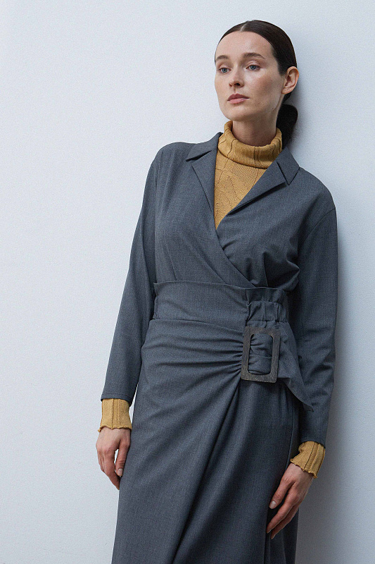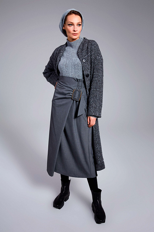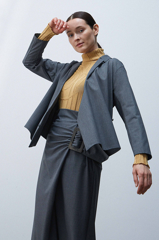Юбка футляр с запахом сложной дизайнерской конструкции с разрезом, облегающего силуэта, высокий пояс с узлом на оригинальной пряжке из рога буйвола, на молнии и резинке. Уникальная ткань нового поколения — керамика, оказывающая благотворное воздействие на здоровье, содержит антибактериальные вещества, препятствующие размножению бактерий и, как следствие, появлению запаха от одежды. Комфортная, пластичная ткань практически не мнется.