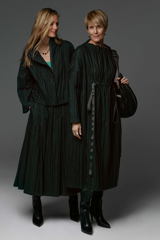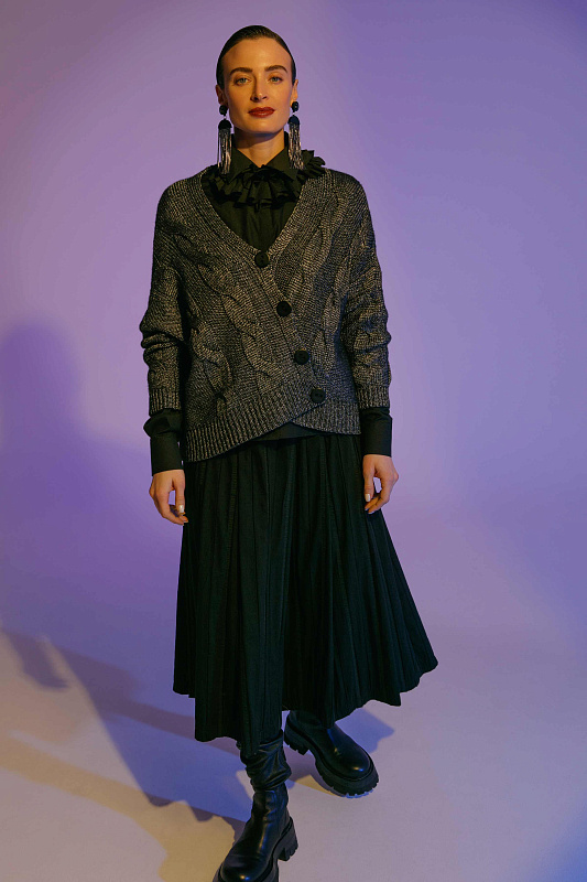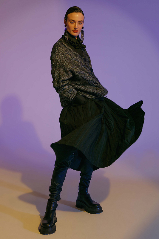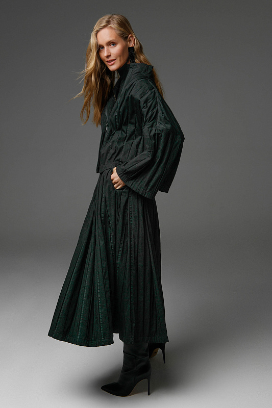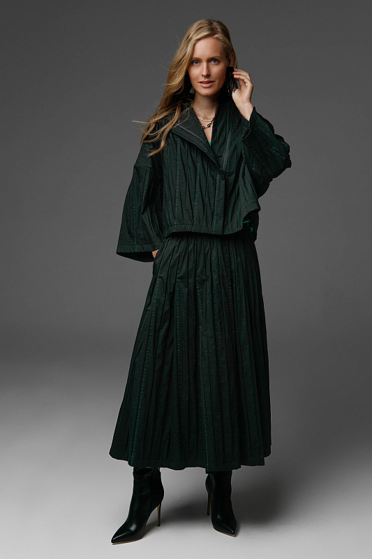 Комфортная креативная юбка в складку из оригинальной фактурной ткани в структурную полоску. Удобные карманы в боковых швах.